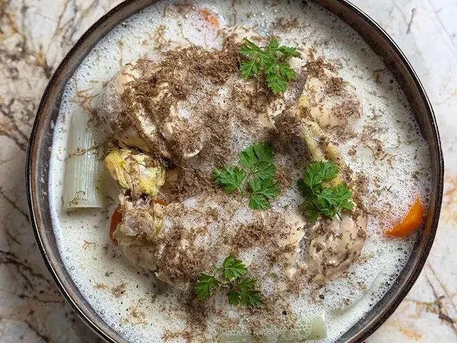 Dans une seconde casserole, récupérer 300 g de bouillon. Mélanger le beurre pommade et la truffe hachée ensemble. Faire réduire le bouillon et verser la crème ainsi que le beurre truffé, mixer et cuire 3 minutes. Hors du feu, verser les jaunes d’œufs en fouettant. Réserver de côté.